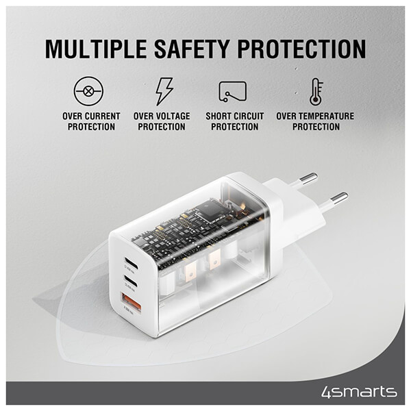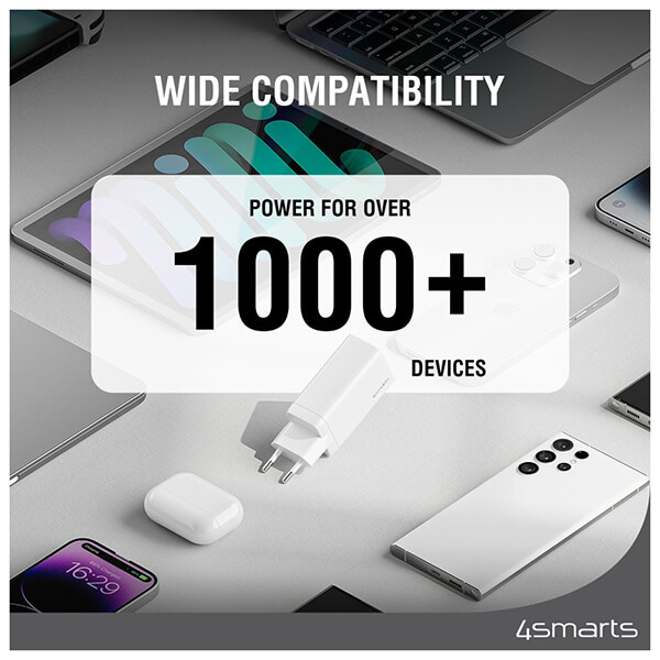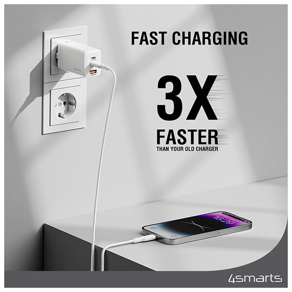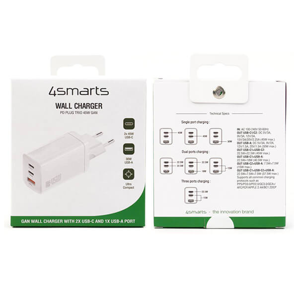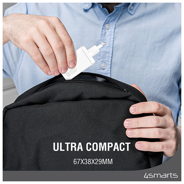Φορτιστής ταξιδιού 4Smarts. -Φορτίζει τη συσκευή σας στη μέγιστη ταχύτητα: Ο φορτιστής GaN μπορεί να φορτίσει όλες τις δημοφιλείς συσκευές στη μέγιστη ταχύτητα. -Φόρτιση πολλών συσκευών ταυτόχρονα: Χάρη σε πολλές θύρες, μπορείτε να φορτίζετε πολλές συσκευές ταυτόχρονα. -Εξοικονόμηση ενέργειας: Η τεχνολογία GaN είναι ιδανική για εξοικονόμηση ενέργειας. Εξοικονομείτε χρήματα και συμβάλλετε στην προστασία του κλίματος. -Μικρός και συμπαγής: Χάρη στην τελευταία λέξη της τεχνολογίας, αυτός ο φορτιστής είναι σημαντικά μικρότερος από ανταγωνιστικά προϊόντα ίδιου μεγέθους. -Μεγάλη διάρκεια ζωής: Κατασκευασμένος με υψηλή ποιότητα, ο φορτιστής σας θα διαρκέσει περισσότερο.