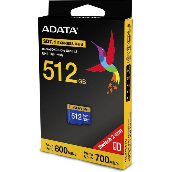 • Χωρητικότητα: 512GB. • Τύπος: microSDXC Express (SD7.1). • Ταχύτητα ανάγνωσης: Έως 800MB/s. • Ταχύτητα εγγραφής: Έως 700MB/s. • Υποστήριξη Video Class: V30. • Συμβατότητα: PCIe Gen3 x1, NVMe, UHS-I. • Αντοχή: Αδιάβροχη, ανθεκτική σε κραδασμούς, ακτινοβολία X, στατική ηλεκτρική εκκένωση και ακραίες θερμοκρασίες. • Διόρθωση σφαλμάτων: LDPC ECC. • Ιδανική χρήση: Nintendo Switch 2, κάμερες 4K/8K, drones, VR headsets. • Κατασκευαστής: ADATA. • Εγγύηση: Εφ' όρου ζωής. DOA 7 ημερών