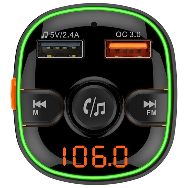 Το FM transmitter θα σας επιτρέψει να απολαύσετε την αγαπημένη σας μουσική σε οποιοδήποτε στερεοφωνικό αυτοκινήτου που διαθέτει ραδιόφωνο και με τα LED θα κάνει το εσωτερικό του πιο φωτεινό και όμορφο. -Μπορεί να αναπαράγει τραγούδια από USB Stick ή μέσω Bluetooth από την συσκευή σας. Ακούστε τα όλα δυνατά στα ηχεία του στερεοφωνικού σας! -Διαθέτει ενσωματωμένο αποκωδικοποιητή MP3/WMA, έτσι ώστε να διαβάζει κατευθείαν τραγούδια από κάρτα micro SD. -Eχει δυνατότητα να συντονιστεί στο πλήρες φάσμα συχνοτήτων με ψηφιακή ρύθμιση (Digital PLL): FM 87.5MHz 108.0MHz (βήμα 0.1MHz). Επιλέξτε εύκολα την πιο καθαρή συχνότητα, ώστε να γίνει η σύζευξη με το στερεοφωνικό σας. -Η ψηφιακή οθόνη LED πολλαπλών ενδείξεων κάνει τη χρήση του FM transmitter εύκολη. -Αποθηκεύει την τελευταία συχνότητα που χρησιμοποιήσατε όταν το απενεργοποιείτε. -Διαθέτει επίσης δυο θύρες USB για να φορτίζετε τις συσκευές σας και να αναπαράγετε μουσική. Η θύρα φόρτισης μπορεί να φορτίσει οποιαδήποτε συσκευή, μιας και προσφέρει 3,4 A έντασης ρεύματος. -Ενεργοποιείται όταν βάζετε μπροστά το αυτοκίνητο. -Διαθέτει μικρόφωνο και συνδέοντας το fm transmitter με το κινητό σας μπορείτε να πραγματοποιήσετε κλήσεις ακούγοντας καθαρά και δυνατά τον συνομιλητή σας από τα ηχεία του αυτοκινήτου. -Αλλάζει αυτόματα τη λειτουργία από αναπαραγωγή μουσικής σε κλήση. Μόλις τελειώσει η κλήση, συνεχίζεται αυτόματα η αναπαραγωγή μουσικής