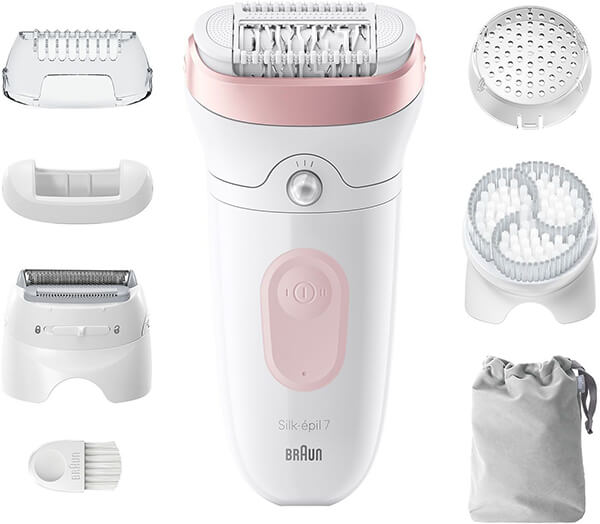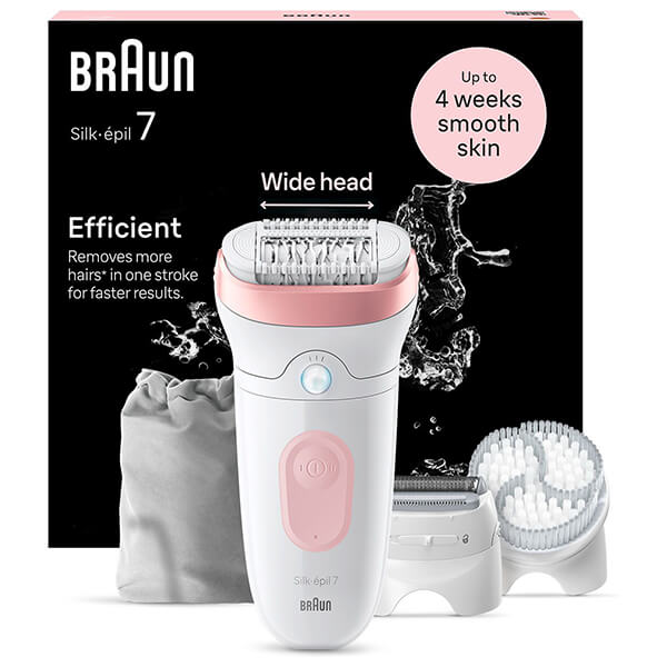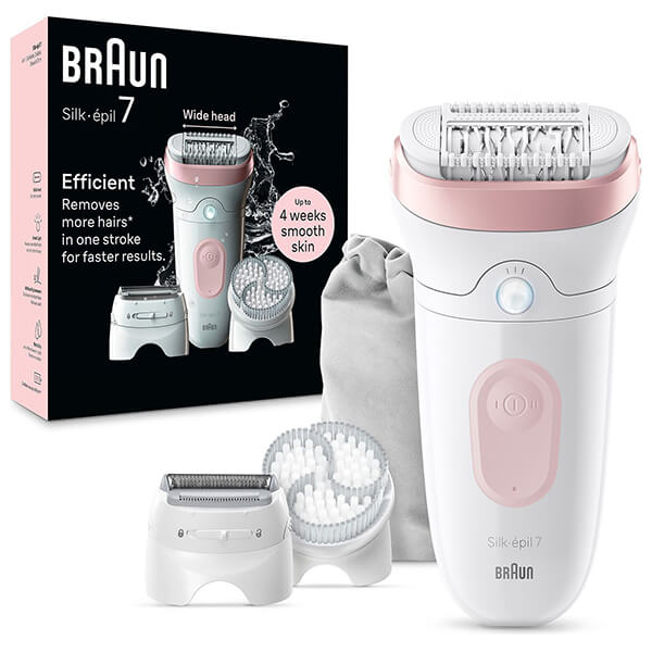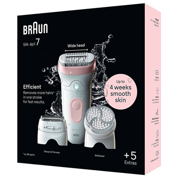 Αποτριχωτική μηχανή Braun Silk-epil 7 με τεχνολογία 40 Micro-Grip για να πιάνει και τις πιο κοντές τρίχες, πλατιά κινούμενη κεφαλή, Smart Light που αποκαλύπτει ακόμα και τις πιο λεπτές τρίχες και αυτονομία 40 λεπτών. Χρησιμοποίησέ την για απολέπιση, αποτρίχωση, ξύρισμα και τριμάρισμα.