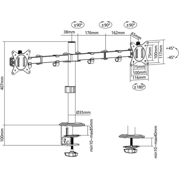Η Βάση για 2 Οθόνες Γραφείου 17"-27" ARLI 1387 είναι μια εργονομική και ανθεκτική λύση για τοποθέτηση δύο οθονών σε γραφείο. Διαθέτει αρθρωτούς βραχίονες που επιτρέπουν ανακλίνηση, περιστροφή και ρύθμιση ύψους, προσφέροντας πλήρη ευελιξία στη διαμόρφωση της εργασιακής σας επιφάνειας. Η ενσωματωμένη διαχείριση καλωδίων διατηρεί το γραφείο σας οργανωμένο και καθαρό. Η βάση κατασκευάζεται από χάλυβα, αλουμίνιο και πλαστικό, με ματ μαύρο φινίρισμα για κομψή εμφάνιση. Είναι συμβατή με πρότυπα VESA 75x75 και 100x100 και μπορεί να υποστηρίξει οθόνες βάρους έως 10 kg η κάθε μία, ενώ το εύρος κλίσης της κυμαίνεται από +45° έως -45°, η περιστροφή από +90° έως -90° και η περιστροφή της οθόνης από +180° έως -180°. Είναι κατάλληλη για τοποθέτηση σε τραπέζι με πάχος 10-85 mm ή μέσω εισόδου καλωδίου 10-80 mm.