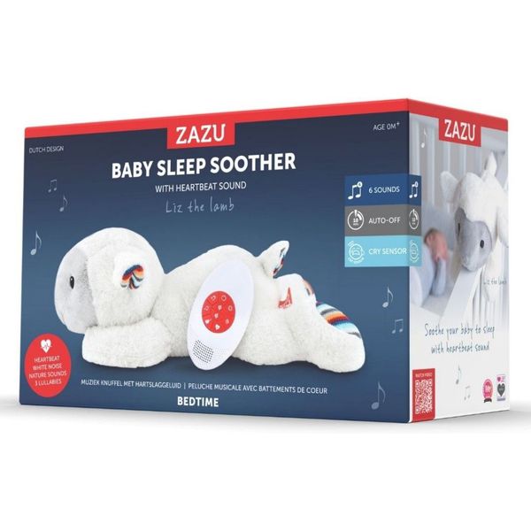 ZAZU στην κατηγορία ΠΑΙΧΝΙΔΙΑ-0-6 ΜΗΝΩΝ Το απαλό κατάλευκο Αρνάκι με συσκευή Ύπνου που αναπαράγει το χτύπο της καρδιάς της μητέρας, (όπως ακούγεται σε ένα υπερηχογράφημα), με λευκούς ήχους (οικείους στο μωρό μέσα απο τη μήτρα) και μελωδίες που κοιμίζει εύκολα ακόμα και τo πιο ανήσυχα μωράκια.
