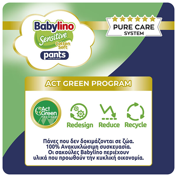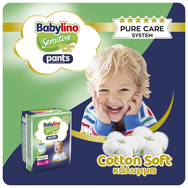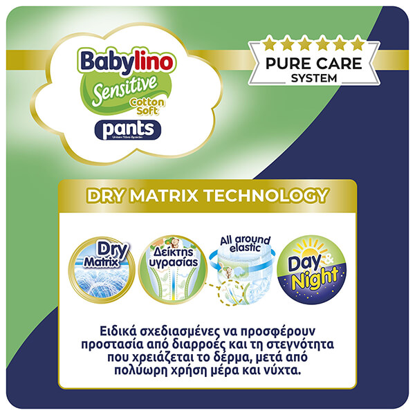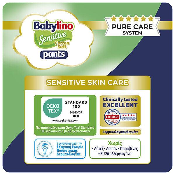 Οι νέες πάνες-βρακάκι Babylino Sensitive Pants Cotton Soft είναι σχεδιασμένες με βάση το Σύστημα Αγνής Φροντίδας Pure Care System, που αποτυπώνει όλο το Σύστημα ελέγχων, πιστοποιήσεων και αυστηρών διαδικασιών διασφάλισης ποιότητας πίσω από την παραγωγή τους. Η τεχνολογία all around elastic προσφέρει 360ο ελαστικότητα περιμετρικά στη μεσούλα και στα ποδαράκια, αγκαλιάζει μοναδικά το σωματάκι του μωρού σε κάθε κίνηση και συγκρατεί την πάνα-βρακάκι σταθερή στη θέση της, χωρίς να «κρεμάει». Κατάλληλες για να διευκολύνουν την αλλαγή της πάνας και το στάδιο εκμάθησης της τουαλέτας, αφού ανεβοκατεβαίνουν εύκολα σαν κανονικό εσώρουχο, χωρίς απαραίτητα το μωρό να είναι σταθερό και σε ύπτια θέση.