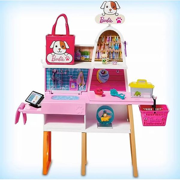 Το μαγαζάκι της Barbie περιλαμβάνει 4 ζωάκια: ένα σκυλάκι, ένα γατάκι, μία χελώνα και ένα χάμστερ σε τροχό, προσφέροντας ποικιλία και ατελείωτες δυνατότητες παιχνιδιού. Με αξεσουάρ όπως κρεβατάκι για τα ζώα, πετσέτα, καλάθι, τσάντα, λουράκι, φούστα και μπαντάνα, τα παιδιά μπορούν να δημιουργούν μοναδικές ιστορίες για κάθε ζώο, ενώ η Barbie φοράει φόρεμα με σχέδια από ζωάκια και αθλητικά παπούτσια για άνεση και στυλ.