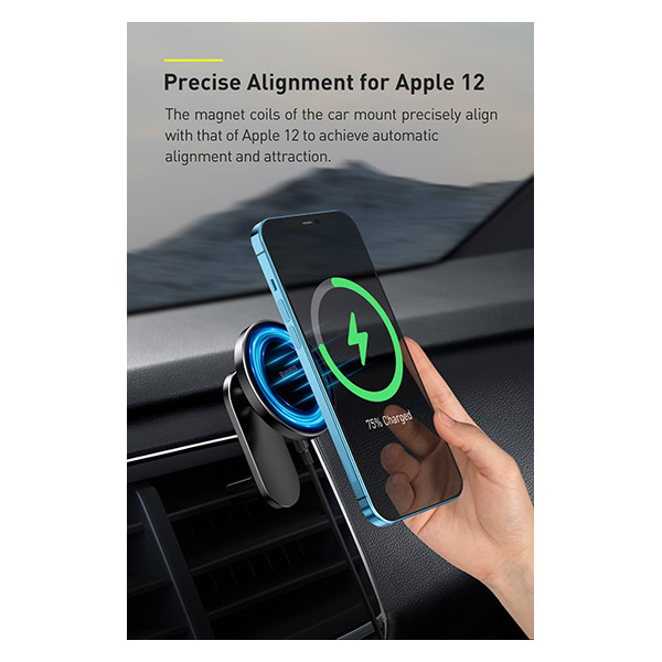 Βάση αεραγωγού αυτοκινήτου Baseus Big Energy με ασύρματη φόρτιση και ενσωματωμένο μαγνήτη συμβατό με τη σειρά iPhone 12 (Apple MagSafe). Διαθέτει δυνατότητα περιστροφής και ισχύ φόρτισης έως 15W.