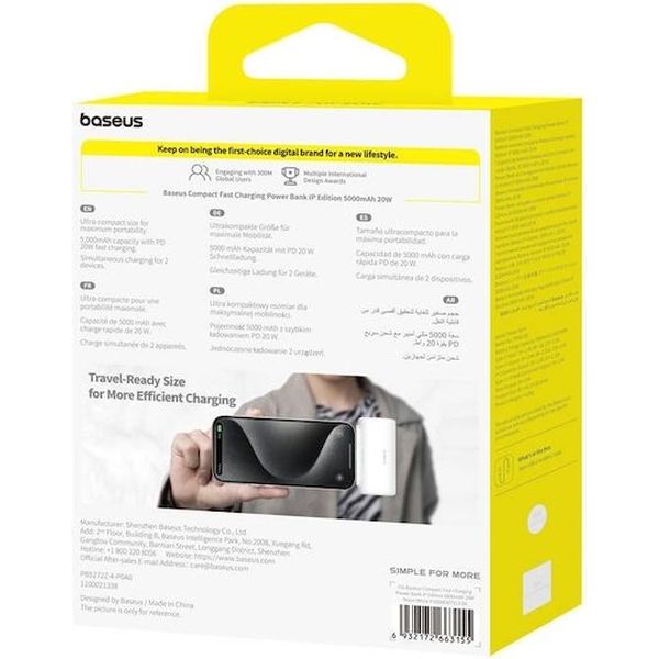 Παρά την ισχύ του, το Baseus Compact ξεχωρίζει για τον μικρό του όγκο και το βάρος μόλις 100g. Με διαστάσεις 80 x 40,2 x 25,6 mm, χωράει άνετα σε τσέπη ή τσάντα, ιδανικό για ταξίδια και καθημερινή χρήση.