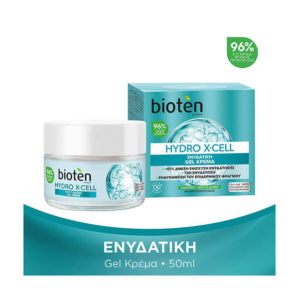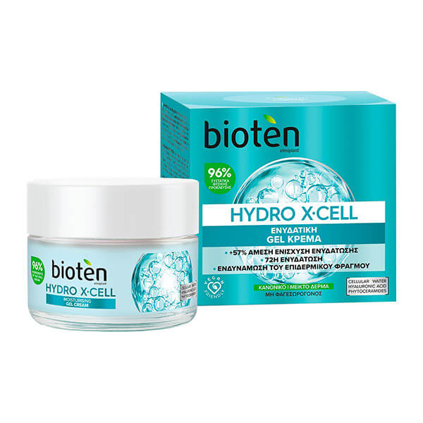 Η ενυδατική gel κρέμα bioten HYDRO X?CELL, με 96 τις εκατό συστατικά φυσικής προέλευσης, είναι η καθημερινή δόση εντατικής ενυδάτωσης για το δέρμα σας! Η ελαφριά, εξαιρετικά ενυδατική gel φόρμουλα περιέχει 5 τις εκατό από ένα ισχυρό, πολλαπλής δράσης ενυδατικό σύμπλοκο με 100 τις εκατό φυσικό Cellular Water από Σπιρουλίνα, Υαλουρονικό Οξύ και φυτικά Ceramides που προσφέρει άμεση ενυδάτωση επιπλεόν 57 τις εκατό και κλειδώνει την υγρασία έως και 72 ώρες. Το πλούσιο σε θρεπτικά συστατικά Spirulina Cellular Water με τη δύναμη του superfood ενισχύει αποτελεσματικά την ενυδάτωση της επιδερμίδας. Το Υαλουρονικό Οξύ βελτιώνει την ελαστικότητα καθώς βοηθά το δέρμα να γεμίσει με ενυδάτωση. Τα φυτικά Ceramides ενισχύουν τoν επιδερμικό φραγμό ώστε να διατηρείται η υγρασία στο δέρμα. Μη φαγεσωρογόνος σύνθεση.