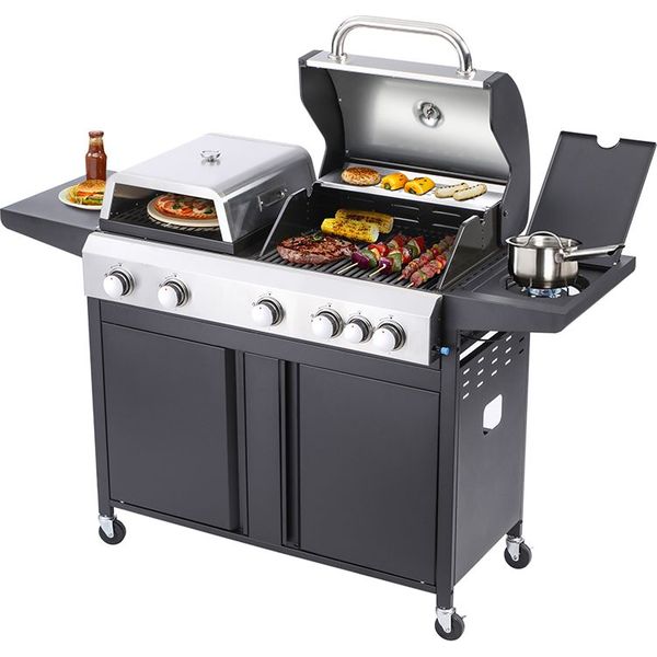 Η BORMANN BBQ5060 είναι μια εντυπωσιακή ψησταριά υγραερίου 3 σε 1 Combo Grill, σχεδιασμένη για όσους θέλουν απόλυτο έλεγχο και ευελιξία στο ψήσιμο. Με θερμική ισχύ 20.5 kW και 5 καυστήρες, προσφέρει σταθερή και ομοιόμορφη απόδοση για μεγάλα και απαιτητικά γεύματα. Διαθέτει διπλή επιφάνεια ψησίματος διαστάσεων 53x45 cm και 42.5x34.5 cm, ενώ η μαντεμένια σχάρα με εμαγιέ επικάλυψη εξασφαλίζει ανθεκτικότητα και σωστή κατανομή θερμότητας. Το ενσωματωμένο θερμόμετρο στο καπάκι και ο ρυθμιζόμενος θερμοστάτης σου επιτρέπουν να ελέγχεις με ακρίβεια κάθε στάδιο του ψησίματος. Η ψησταριά είναι εξοπλισμένη με πλευρική εστία και plancha, προσφέροντας δυνατότητα για ταυτόχρονη προετοιμασία συνοδευτικών και διαφορετικών τύπων ψησίματος. Περιλαμβάνει επίσης φούρνο για πίτσα με μετρητή θερμοκρασίας, μετατρέποντας το BBQ σε πλήρες outdoor kitchen. Για άνεση και πρακτικότητα, διαθέτει πλαϊνά ράφια, ροδάκια για εύκολη μετακίνηση και θέση για σούβλα. Το αποσπώμενο συρτάρι συλλογής λίπους και ο αφαιρούμενος συλλέκτης λίπους διευκολύνουν τον καθαρισμό μετά από κάθε χρήση. - Θερμική Ισχύς: 20.5 kW