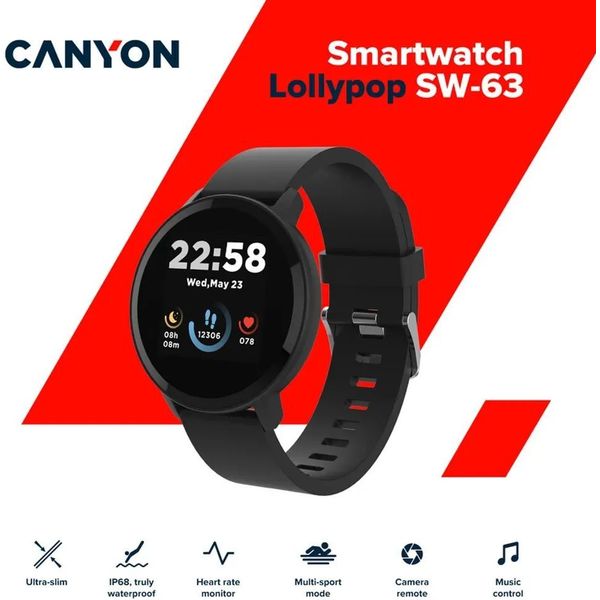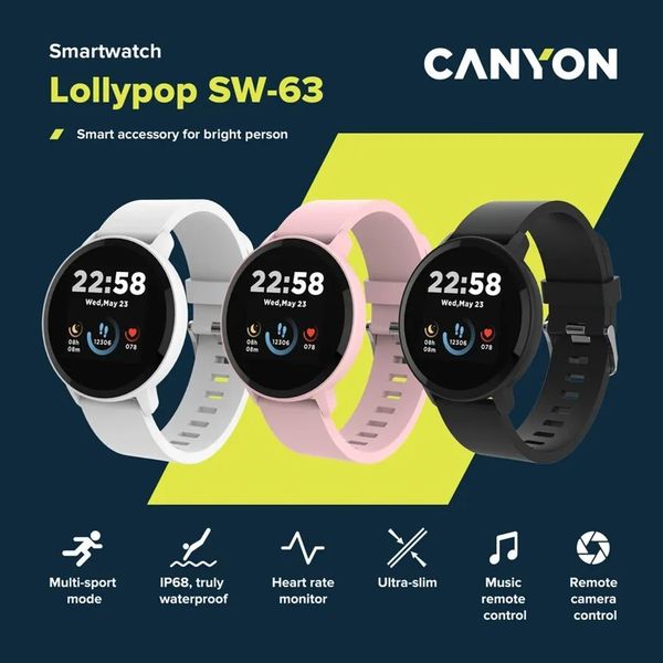 Το Smart Watch Lollypop SW-63 της Canyon συνδυάζει κομψό, στρογγυλεμένο σχεδιασμό με πρακτικές λειτουργίες ευεξίας και έξυπνης συνδεσιμότητας. Συνδέεται άμεσα με το smartphone μέσω Bluetooth 5.0 και λειτουργεί σε συνεργασία με την εφαρμογή Canyon Life, προσφέροντάς σας πλήρη εικόνα της φυσικής σας δραστηριότητας και της ποιότητας του ύπνου σας μέσα από ένα ευχάριστο και κατανοητό περιβάλλον.