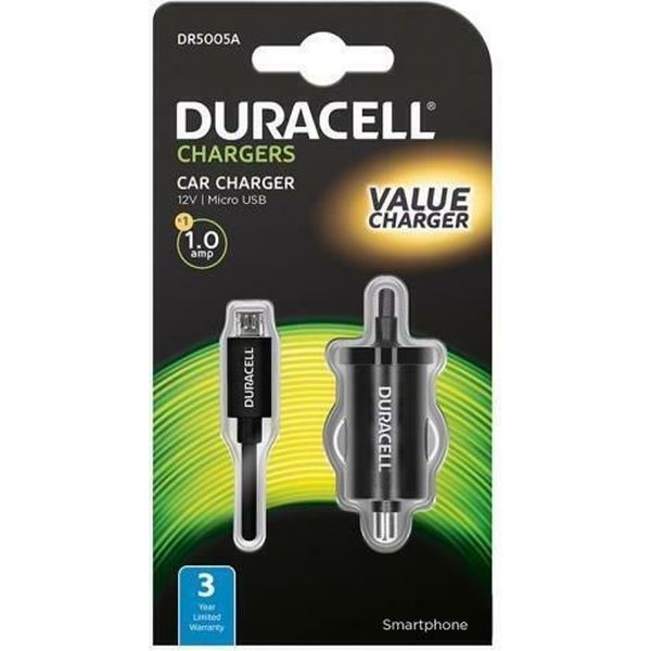 CAR FAST CHARGER DURACELL WITH BUILT-IN MICRO USB CABLE BLACK
