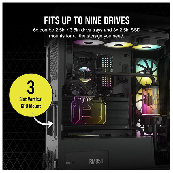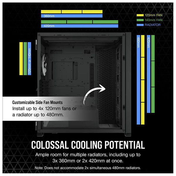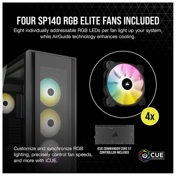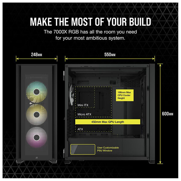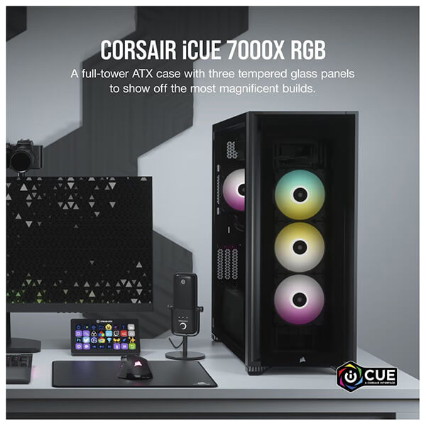 Η θήκη CORSAIR iCUE 7000X RGB full-tower ATX προβάλλει την κατασκευή σας με τρία πάνελ σκληρυμένου γυαλιού, με χώρο για έως και τρία ταυτόχρονα radiator 360 mm, κρυφή διαχείριση καλωδίων και τέσσερις ανεμιστήρες CORSAIR SP140 RGB ELITE. -Το iCUE 7000X RGB είναι ένας από τους πιο πλήρως εξοπλισμένους full-towers στην αγορά, με τεράστιες δυνατότητες επέκτασης. -Τρία στιβαρά πάνελ σκληρυμένου γυαλιού πάχους 4 mm προσφέρουν πλήρη εικόνα του συστήματός σας. -Περάστε γρήγορα και εύκολα τα κύρια καλώδιά σας μέσω ενός μόνο κρυφού καναλιού, με ευρύχωρο χώρο 25 mm πίσω από τη μητρική πλακέτα. -Eνα αφαιρούμενο, προσαρμόσιμο κάλυμμα PSU με παράθυρο δείχνει την καρδιά του συστήματός σας. Αφαιρέστε το πάνελ, χαράξτε το δικό σας λογότυπο με λέιζερ ή προσθέστε οπίσθιο φωτισμό για να κάνετε το σύστημα σας να ξεχωρίζει. -Τα λογισμικά iCUE 7000X RGB και CORSAIR iCUE προσφέρουν την καλύτερη τεχνολογία στην κατηγορία τους. Το iCUE επιτρέπει εύκολα προσαρμόσιμο φωτισμό RGB και ρυθμιζόμενο από τον χρήστη έλεγχο ταχύτητας ανεμιστήρα για έως και έξι ανεμιστήρες.