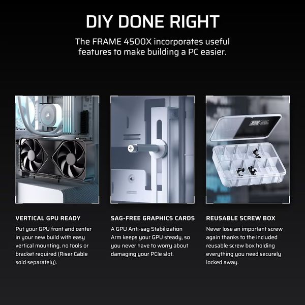 Το CORSAIR FRAME 4500X RS-R ARGB είναι ένα mid-tower PC case με εντυπωσιακή πανοραμική γυάλινη πλευρική και μπροστινή επιφάνεια, σχεδιασμένο για να αναδεικνύει το εσωτερικό της κατασκευής σας. Διαθέτει το σύστημα InfiniRail για εύκολη τοποθέτηση ανεμιστήρων και υποστήριξη διπλών 360mm ραδιατόρων, ενώ τα 3 προεγκατεστημένα RS-R ARGB 120mm reverse-rotor fans εξασφαλίζουν αποτελεσματική ψύξη και εντυπωσιακό φωτισμό. Η σχεδίαση περιλαμβάνει πλήρως συμβατό χώρο για κάθετο mounting GPU, arm σταθεροποίησης για αποφυγή sag, καθώς και εκτεταμένες επιλογές διαχείρισης καλωδίων για καθαρή και οργανωμένη κατασκευή.