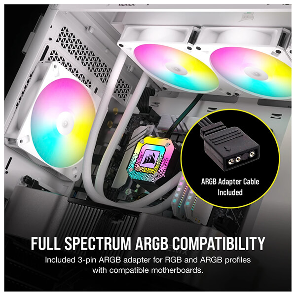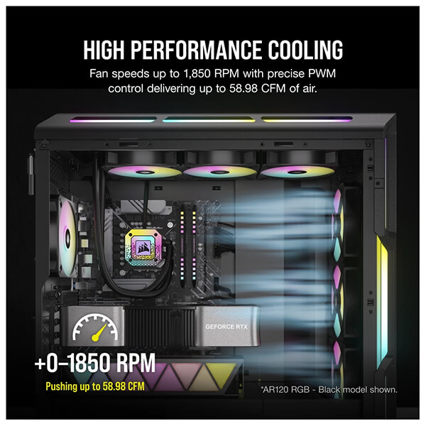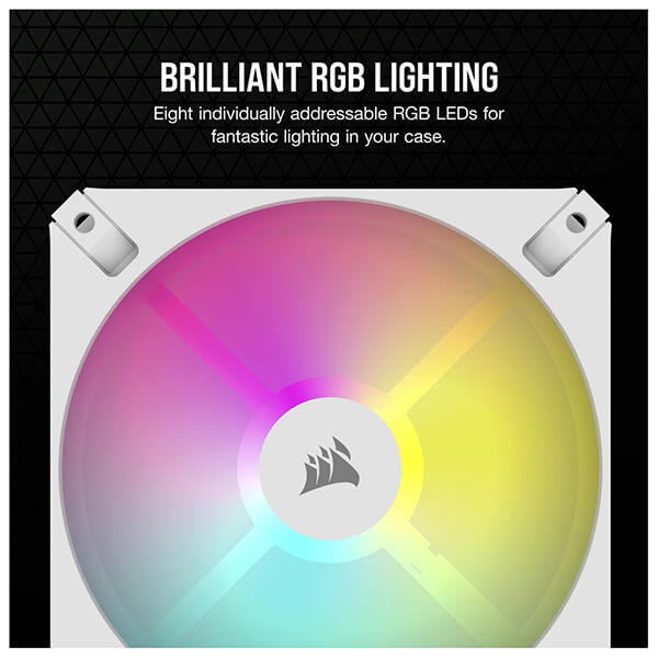 Ανεμιστήρας κουτιού 120mm της Corsair με μέγιστη ταχύτητα 1.850 rpm η οποία ελέγχεται μέσω σύνδεσης 4-Pin PWM. Διαθέτει οκτώ μεμονωμένα RGB LED που προσφέρουν εφέ φωτισμού και ελέγχονται μέσω 3-pin ARGB adapter.