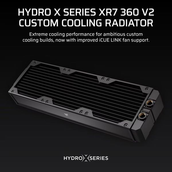 Το CORSAIR Hydro X Series XR7 360 V2 είναι ένα κορυφαίας κατηγορίας ψυγείο υδρόψυξης σχεδιασμένο για enthusiasts που απαιτούν μέγιστη απόδοση σε demanding custom loops. Με εντυπωσιακό πάχος 55mm και υψηλής πυκνότητας πτερύγια 25 micron, προσφέρει τεράστια θερμική επιφάνεια και εξαιρετική αποβολή θερμότητας, καθιστώντας το ιδανικό για overclocked συστήματα, multi-block loops και απαιτητικά setups. Η πλήρης συμβατότητα με iCUE LINK επιτρέπει καθαρό και οργανωμένο cable management, ενώ η δυνατότητα τοποθέτησης ανεμιστήρων και στις δύο πλευρές εξασφαλίζει push-pull διαμορφώσεις για μέγιστη ροή αέρα. Με στιβαρή κατασκευή από χαλκό και ορείχαλκο, Screw Protection Plates για ασφαλή τοποθέτηση και υψηλής ποιότητας polyurethane coating, το XR7 360 V2 προσφέρει επαγγελματική απόδοση και αξιοπιστία για κάθε premium υδρόψυξη. - Υλικό: Χαλκός / Ορείχαλκος