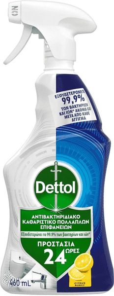Το Dettol Πολυκαθαριστικό 24 Ώρες Ocean Fresh έχει σχεδιαστεί να εξουδετερώνει το 99,9%* των βακτηρίων και ιών* στις επιφάνειες σας για 24 ώρες ακόμα και αν τις αγγίξετε πολλαπλές φορές και χωρίς να αφήνει κολλώδη υπολείμματα Εξουδετερώνει το 99,9% των ιών και και βακτηριδίων.Αποτελεσματικό ενάντια στον Covid-19.Αφήνει τις επιφάνειες υγιεινά καθαρές.Ασφαλές για τον καθαρισμό των επιφανειών προετοιμασίας φαγητού.Κατάλληλο για τον καθημερινό καθαρισμό όλων των επιφανειών. Συστατικά: Ανά 100g υγρού, περιέχονται 0,11g Benzalkonium chloride (CAS 68424-85-1). Περιέχει <5% μη ιονικά επιφανειοδραστικά, Απολυμαντικό, ’ρωμα, Hexyl Cinnamal. ΟΔΗΓΙΕΣ ΧΡΗΣΗΣ: 1. Γυρίστε το ακροφύσιο στη θέση ON. 2. Κρατώντας το μπουκάλι όρθιο, ψεκάστε από απόσταση 20-25 εκ. 3. Αφήστε το προϊόν να δράσει για 5 λεπτά, καθαρίστε σκουπίζοντας και μετά ξεβγάλτε. 4. Δοκιμάστε το προϊόν πάντα πριν τη χρήση, αφήνοντάς το για 5 λεπτά σε κάποιο σημείο της επιφάνειας που δεν φαίνεται. Ακατάλληλο για:Πορώδεις επιφάνειες όπως μάρμαρα, ξύλο, βαμμένες επιφάνειες, επιφάνειες εμαγιέ, μεταλλικές ή επιχρυσωμένες επιφάνειες. Μην το αφήνετε σε επαφή με πλαστικά για πολύ χρόνο. Ξεπλύνετε καλά με νερό τις επιφάνειες που έρχονται σε επαφή με φαγητό.