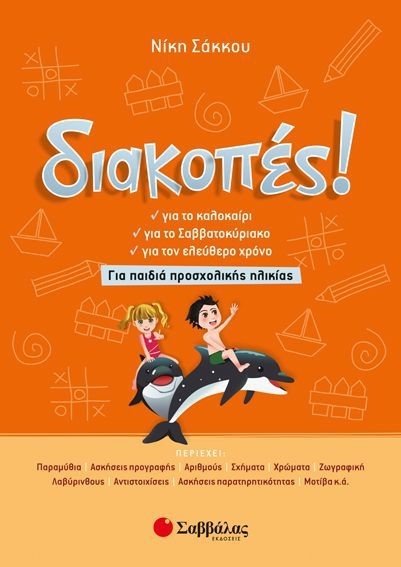 Το βιβλίο αυτό της σειράς ΔΙΑΚΟΠΕΣ! είναι γραμμένο με σύγχρονη παιδαγωγική αντίληψη και με μοντέρνα θεματολογία. Δίνει την ευκαιρία για δημιουργική απασχόληση των παιδιών προσχολικής ηλικίας, καθώς συνδυάζει τη χαρά του παιχνιδιού και της δημιουργίας με βασικές έννοιες και δεξιότητες.