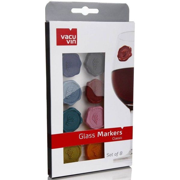 Βαρεθήκατε να χάνετε το ποτήρι σας στα πάρτυ; Τα διακριτικά ποτηριών από την Vacu Vin αποτελούν την τέλεια λύση για κάθε συνεστίαση καθώς με την βεντούζα στην πίσω πλευρά τους, προσαρμόζονται εύκολα στο ποτήρι σας. Το σετ περιέχει 8 διακριτικά σε σχήμα σφραγίδας κρασιού, σε 8 διαφορετικές αποχρώσεις και με 8 διαφορετικές ποικιλίες σταφυλιών τυπωμένες πάνω τους: Cabernet Sauvignon, Pinot blanc, Sauvignon blanc, Merlot, Syrah, Pinot Noir, Chardonnay και Riesling. Βρείτε εύκολα το ποτήρι σας με μια ματιά!
