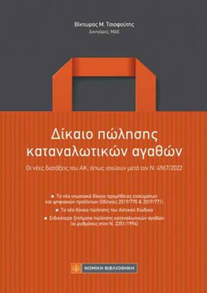 ISBN: 978-960-654-909-0 Συγγραφέας: ΤΣΙΑΦΟΥΤΗΣ ΒΙΚΤΩΡΑΣ Εκδοτικός οίκος: ΝΟΜΙΚΗ ΒΙΒΛΙΟΘΗΚΗ Σελίδες: 320 Διαστάσεις: 17Χ24 Ημερομηνία Έκδοσης: Οκτώβριος 2022 Στο βιβλίο «Δίκαιο πώλησης καταναλωτικών αγαθών» αναλύονται με ευσύνοπτο τρόπο όλα τα ζητήματα που αφορούν τις συμβάσεις πώλησης που συνάπτονται μεταξύ προμηθευτών και καταναλωτών. Χωρίς να παραλείπεται η ανάλυση των διατάξεων του ΑΚ για την πώληση εν γένει, έμφαση δίνεται στην αναλυτική συστηματοποίηση της πληθώρας ειδικότερων διατάξεων της ελληνικής νομοθεσίας σχετικά με τις συμβάσεις πώλησης καταναλωτικών αγαθών. Παράλληλα, η ενσωμάτωση των Οδηγιών 2019/770 και 2019/771 έφερε σημαντικές αλλαγές στο δίκαιο της πώλησης του ΑΚ και γενικότερα στο δίκαιο προμήθειας καταναλωτικών αγαθών, ενσώματων και ψηφιακών. Το δίκαιο της πώλησης εκσυγχρονίζεται στα δεδομένα της ψηφιακής τεχνολογίας, οι απαιτήσεις συμμόρφωσης των αγαθών στη σύμβαση διευρύνονται σημαντικά, ενώ πλέον τα δικαιώματα του αγοραστή ιεραρχούνται. Ταυτόχρονα λοιπόν με την εξέταση ειδικότερων ζητημάτων που άπτονται των συμβάσεων πώλησης αγαθών σε καταναλωτές (και αφορούν ενδεικτικά τις συμβάσεις από απόσταση και εκτός εμπορικού καταστήματος, τις υποχρεώσεις προσυμβατικής ενημέρωσης των προμηθευτών, το ηλεκτρονικό εμπόριο, τους Γενικούς Όρους Συναλλαγών σε συμβάσεις πώλησης με χαρακτήρα προσχώρησης, τις χρηματοδοτούμενες αγορές οχημάτων κ.ά.), στο βιβλίο επιχειρείται με μία πρώτη ανάλυση των νέων διατάξεων του ΑΚ για την πώληση, έπειτα από την ενσωμάτωση της Οδηγίας 2019/771. Τέλος, γίνεται μία σύντομη αναφορά στο νέο δίκαιο προμήθειας ψηφιακού περιεχομένου και ψηφιακών υπηρεσιών, σύμφωνα με το Ν. 4967/2022, με ιδιαίτερη έμφαση στο κρίσιμο ερώτημα πότε εφαρμόζονται οι νέες διατάξεις του ΑΚ και πότε του Ν. 4967/2022. Το βιβλίο απευθύνεται κατεξοχήν σε νομικούς και δικηγόρους που ασχολούνται, θεωρητικά ή πρακτικά, με το δίκαιο πώλησης καταναλωτικών αγαθών, είτε από την πλευρά των καταναλωτών είτε από την πλευρά των προμηθευτών.