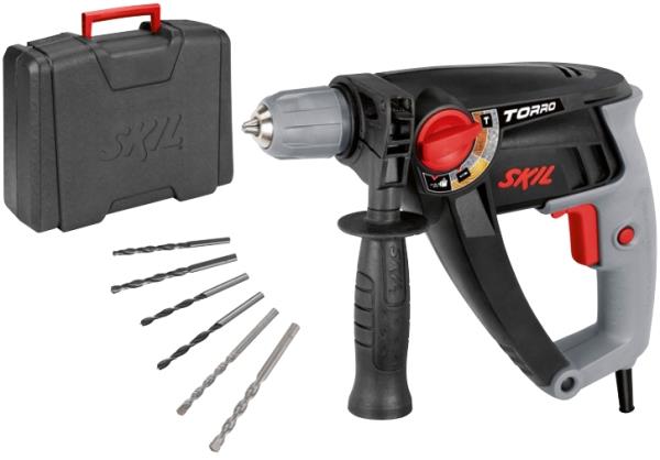 Ηλεκτρικό κρουστικό δράπανο Skil F0156950AD. Χαρακτηριστικά: - Τσοκ 10 m. - Δεν απαιτούνται ειδικά τρυπάνια, μπορούν να χρησιμοποιηθούν στάνταρ τρυπάνια στρογγυλού στελέχους. - Μεγάλος διακόπτης για εύκολη επιλογή υλικού. - Σύστημα μείωσης των κραδασμών (VRS): Χαμηλοί κραδασμοί σημαίνει ιδανική άνεση εργασίας. - Μεγάλος διακόπτης ρυθμιζόμενης ταχύτητας για εύκολη λειτουργία. - Διακόπτης ασφάλισης για συνεχή εργασία. - Λειτουργία όπισθεν για το βίδωμα. - Εργονομικός σχεδιασμός για βέλτιστη άνεση και άριστο έλεγχο. - Πρόσθετη χειρολαβή, ρυθμιζόμενη χωρίς αυξομειώσεις, για ασφαλή έλεγχο με τα δύο χέρια. - Εύκολα ρυθμιζόμενος οδηγός βάθους, για την προεπιλογή του βάθους τρυπήματος κατά το άνοιγμα τυφλών οπών. Τάση: 230 V/ 50 Hz.Ισχύς: 550 W.Ταχύτητα χωρίς φορτίο: 0-3.000 rpm.Τσοκ: απλό δακτυλίδι χωρίς κλειδί: 10 mm.Δυνατότητα τρυπήματος σε σκυρόδεμα: 10 mm.Δυνατότητα τρυπήματος σε μέταλλο: 13 mm.Δυνατότητα τρυπήματος σε τοιχοποιία: 16 mm.Δυνατότητα τρυπήματος σε ξύλο: 35 mm.Κρούσεις: 0-45.000 ipm.Βάρος: 1.9 kg.Θόρυβος: 106 db.Κραδασμοί (τρύπημα σε μέταλλο): 3.6 m/s².Κραδασμοί (τρύπημα με κρούση σε μπετόν): 19.2 m/s².Περιεχόμενα συσκευασίας: Πρόσθετη χειρολαβή, Μετρητής βάθους, Υψηλής ποιότητας σετ τρυπανιών πέτρας 2 τεμαχίων (∅ 6/8 mm), Σετ τρυπανιών ξύλου 2 τεμαχίων (∅ 6/8 mm), Σετ τρυπανιών χάλυβα 2 τεμαχίων (∅ 6/8 mm), Πλαστική θήκη μεταφοράς.Εγγύηση: 2 χρόνια.