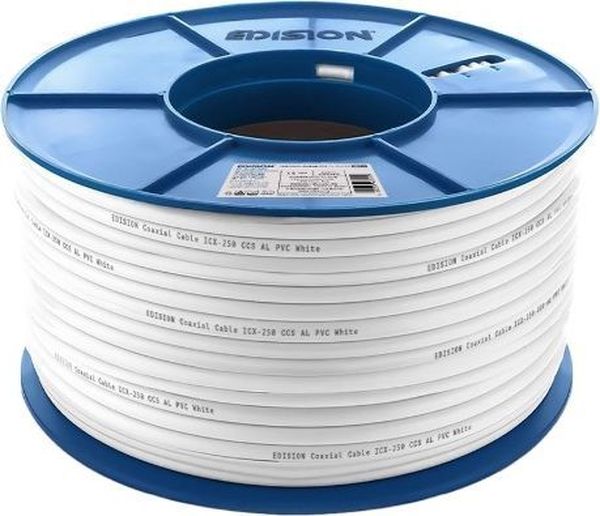 Το ομοαξονικό καλώδιο Edision ICX-250 CCS AL Eca PVC σε λευκό χρώμα και μήκος 250 μέτρων είναι ιδανικό για εσωτερική χρήση σε διανομή σήματος επίγειας ψηφιακής και δορυφορικής τηλεόρασης, καθώς και για CCTV. Είναι κατάλληλο για επέκταση καλωδίου, προσθήκη τμήματος ή αντικατάσταση φθαρμένου, εξασφαλίζοντας αξιόπιστη σύνδεση μεταξύ κεραίας και τηλεόρασης. Ο κεντρικός αγωγός από επιχαλκωμένο σίδηρο (CCS) προσφέρει υψηλή αγωγιμότητα, ενώ η διπλή θωράκιση Class A από αλουμίνιο προστατεύει από παρεμβολές. Το εξωτερικό περίβλημα από PVC εξασφαλίζει ευκαμψία και προστασία από περιβαλλοντικές επιδράσεις.