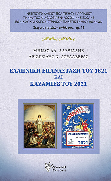 Συγκεντρώσαμε έτσι 17 Καζαμίες του 2021, από τους οποίους 12, δηλαδή, τα δύο τρίτα περίπου, είχαν ιστορικό υλικό για το 1821. Προέκυψαν λοιπόν 46 κείμενα, τα οποία κατατάξαμε θεματικά σε τρεις κατηγορίες: Προεπαναστατικά, Κατά την Επανάσταση και Μετεπαναστατικά. Φυσικά, τα περισσότερα θέματα (συνολικά 31 από τα 46) αναφέρονται σε γεγονότα και πρόσωπα της Επανάστασης. Στην έκδοση αυτή αρχικά δίνουμε στοιχεία για τον Καζαμία ως λαϊκό βιβλίο και στη συνέχεια εξετάζουμε τα πολύχρωμα εξώφυλλα των Καζαμιών, με τον βασικό και τους συμπληρωματικούς τίτλους, το εικαστικό υλικό και τους εκδότες τους. Τα ίδια τα κείμενα, φυσικά, μας οδήγησαν σε σκέψεις, σχόλια και προβληματισμούς. Κατόπιν δόθηκαν περιλήψεις των κειμένων, προκειμένου να υπάρχει στοιχειώδης ενημέρωση για τους αναγνώστες.