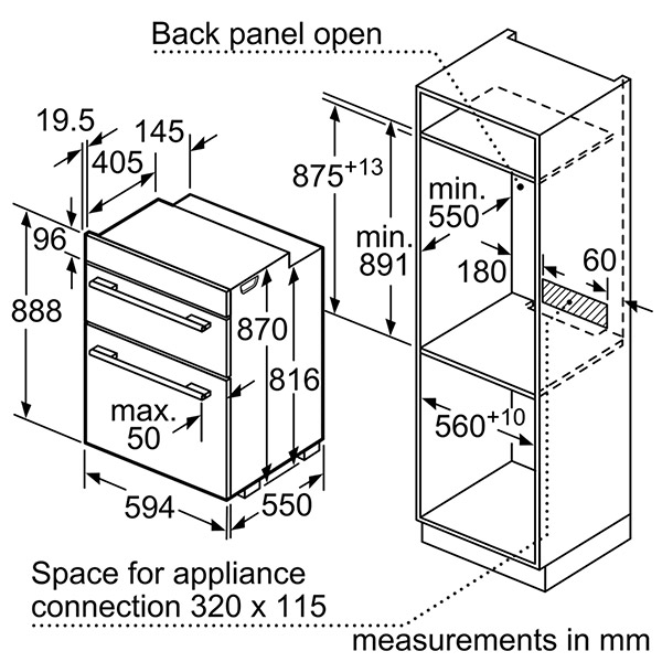 Διαστάσεις εντοιχισμού (ΥxΠxΒ): 875 mm - 888 mm x 560 mm - 568 mm x 550 mm.