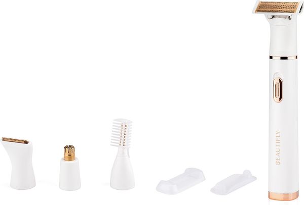 Γνωρίστε την επαναφορτιζόμενη ξυριστική μηχανή με 4 διαφορετικές επιχρυσωμένες κεφαλές 24 καρατίων από τη Beautifly! Ιδανική για πρόσωπο και σώμα, διαθέτει κεφαλές για φρύδια, μύτη, φαβορίτες και σώμα, που κόβουν ακόμα και τις πιο κοντές τρίχες χωρίς ερεθισμούς ή αλλεργίες, καθιστώντας την ιδανική για ευαίσθητο δέρμα. Με λεπίδες ακριβείας και αυτονομία 90 λεπτών, φορτίζει σε 90 λεπτά και περιλαμβάνει καλώδιο φόρτισης USB. Ελαφριά, μόλις 50 g.