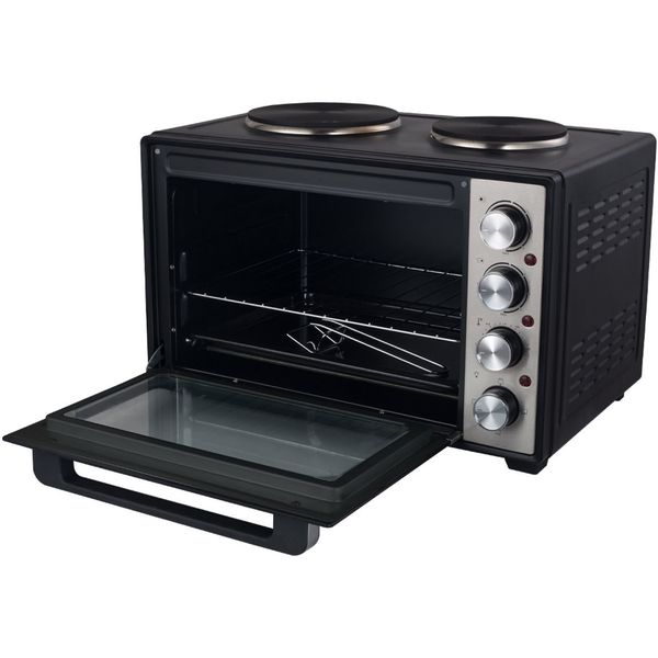 • Λειτουργίες: 2 μαγειρικές εστίες, 3 λειτουργίες αντίστασης (πάνω, κάτω, πάνω & κάτω), αντικολλητικό εσωτερικό, εσωτερικός φωτισμός