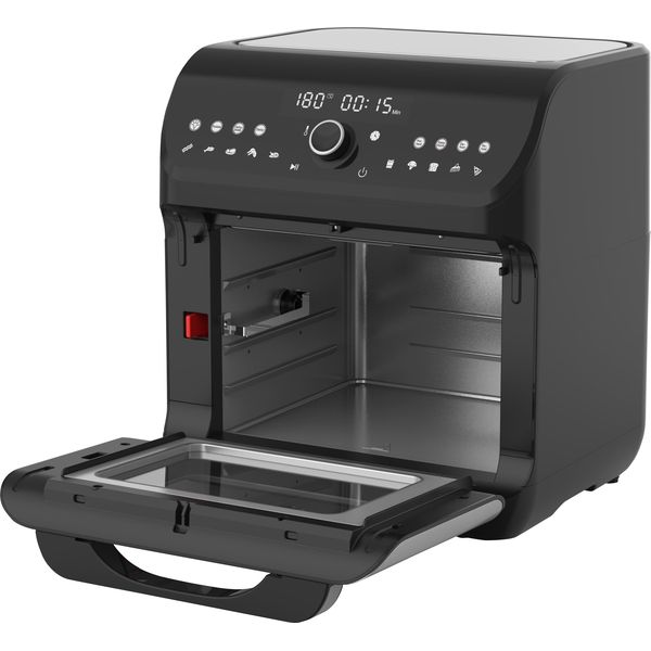 Mοντέρνος σχεδιασμός με μαύρο χρώμα , προσδίδει κομψότητα στον χώρο σας. Το διπλό πυράντοχο γυαλί εξασφαλίζει ασφάλεια, ενώ ο εσωτερικός φωτισμός σας επιτρέπει να παρακολουθείτε το μαγείρεμα. Περιλαμβάνει δύο διάτρητες σχάρες ψησίματος, ένα ομοιόμορφα περιστρεφόμενο καλάθι τηγανίσματος για ομοιόμορφο, τραγανό αποτέλεσμα στα φαγητά σας και μια περιστρεφόμενη σούβλα για μεγάλα κομμάτια κρέατος,, δίσκο για ψίχουλα και σχάρα, κάνοντας το μαγείρεμα πιο εύκολο και πρακτικό.