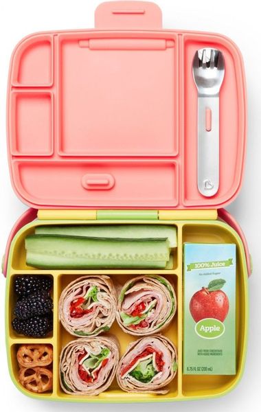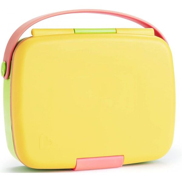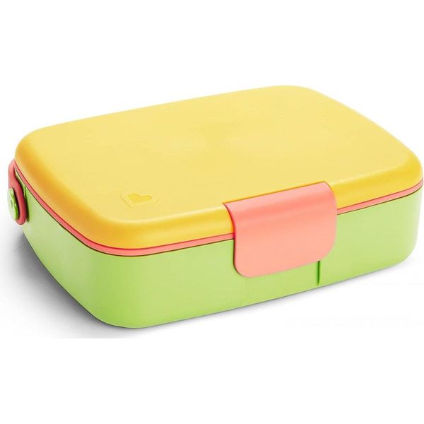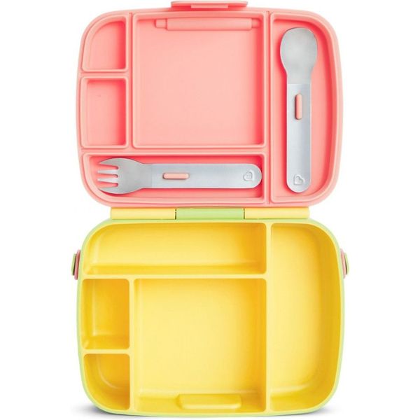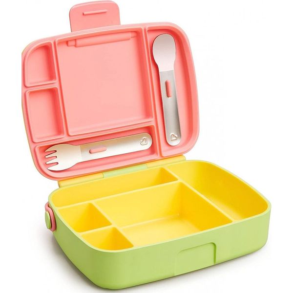 MUNCHKIN στην κατηγορία ΤΑΙΣΜΑ ΝΗΠΙΑΚΗΣ ΗΛΙΚΙΑΣ Τα παιδιά προσχολικής ηλικίας μπορούν να γίνουν πολύ απαιτητικά για οτιδήποτε - ειδικά για το φαγητό. Το Lunch Bento Box με κουταλοπήρουνα θα σας σώσει από πολλούς μπελάδες σχετικά με το φαγητό. Σχεδιασμένο για μικρές μερίδες και μικρά χεράκια, το παιδικό δοχείο που δε στάζει είναι ιδανικό για υγιεινά γεύματα στο σχολείο. Πετάξτε τα σακουλάκια και πακετάρετε το μεσημεριανό, τα σνακ, τα γλυκίσματα κτλ. σε ένα δοχείο τύπου «bento», ωραίο και πρακτικό. Με 5 χωριστά διαμερίσματα, τα τρόφιμα δεν ανακατεύονται και δεν έρχονται σε επαφή μεταξύ τους, ενώ έχουν το κατάλληλο μέγεθος για ένα θρεπτικό παιδικό γεύμα. Το παιδικό δοχείο μεσημεριανού παρέχεται με ταιριαστά ανοξείδωτα παιδικά κουταλοπήρουνα στο καπάκι. Αυτό θα πει φαγητό με στιλ!