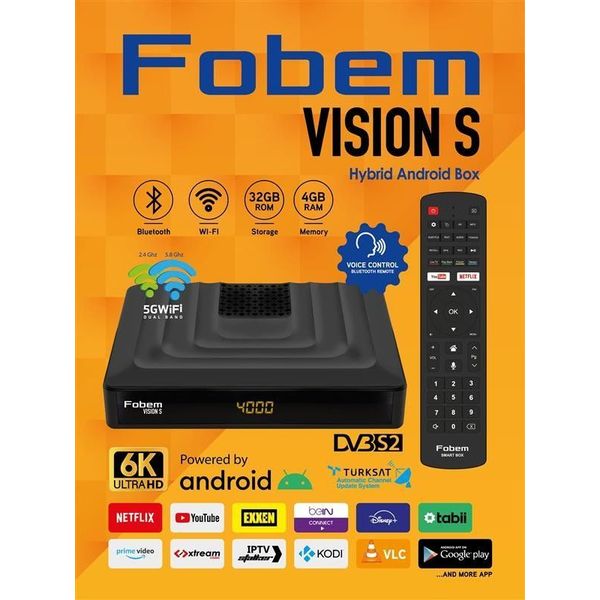 Το Android Box & Δορυφορικός Δέκτης FOBEM VISION S συνδυάζει τις δυνατότητες ενός σύγχρονου Android Box με έναν πλήρη δέκτη DVB-S2, επιτρέποντάς σας να απολαμβάνετε τόσο διαδικτυακές εφαρμογές όσο και τα αγαπημένα σας δορυφορικά κανάλια. Με τον τετραπύρηνο επεξεργαστή H618 Cortex A53, 4 GB DDR3 RAM και 32 GB εσωτερική μνήμη, οι εφαρμογές τρέχουν γρήγορα και ομαλά, ενώ η σύνδεση Ethernet και τα dual-band Wi-Fi 2.4/5.8 GHz προσφέρουν υψηλές ταχύτητες για streaming και εγκατάσταση εφαρμογών. Υποστηρίζει ανάλυση βίντεο έως 6K Ultra HD με HDR10+, προσφέροντας εξαιρετική ποιότητα εικόνας για ταινίες και τηλεοπτικές σειρές. Ο ενσωματωμένος δέκτης HD DVB-S2 και το τηλεχειριστήριο με δυνατότητα φωνητικού ελέγχου καθιστούν τη χρήση εύκολη και άνετη. Διαθέτει επίσης 2 θύρες USB 2.0, HDMI 2.0 με 4K/60fps, AV 3,5mm stereo και Bluetooth 5.2 για σύνδεση περιφερειακών.