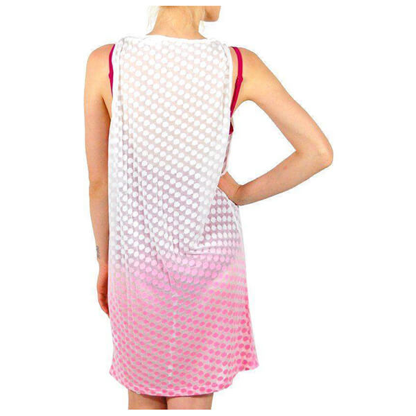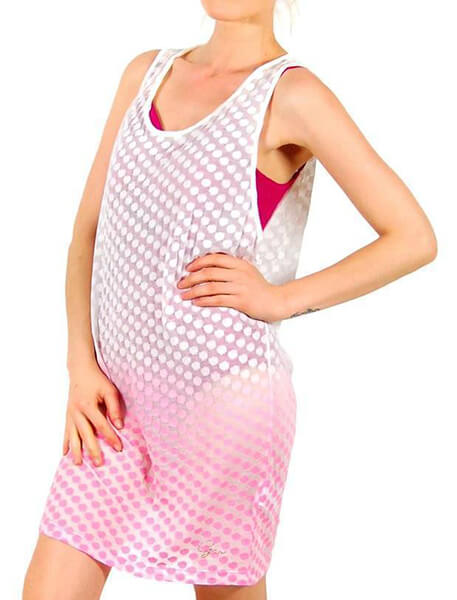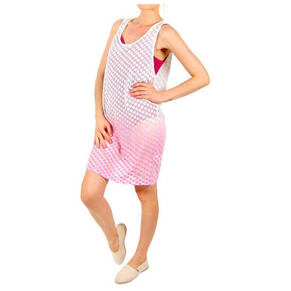 Ένα απόλυτα καλοκαιρινό φόρεμα με λευκό το πάνω μισό μέρος και ροζ το υπόλοιπο. Κάτω αριστερά έχει μια λεπτομέρεια από τρουκς με το λογότυπο της εταιρείας. Έχει αέρινη εφαρμογή και η υφή του είναι εξαιρετικά μαλακή.