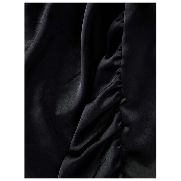 Έχει ανοιχτή λαιμόκοψη, σούρες στα πλαϊνά και είναι από σατέν ύφασμα.