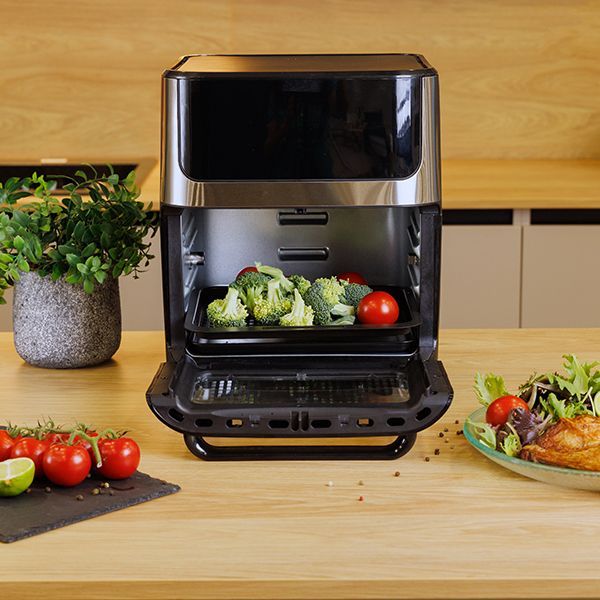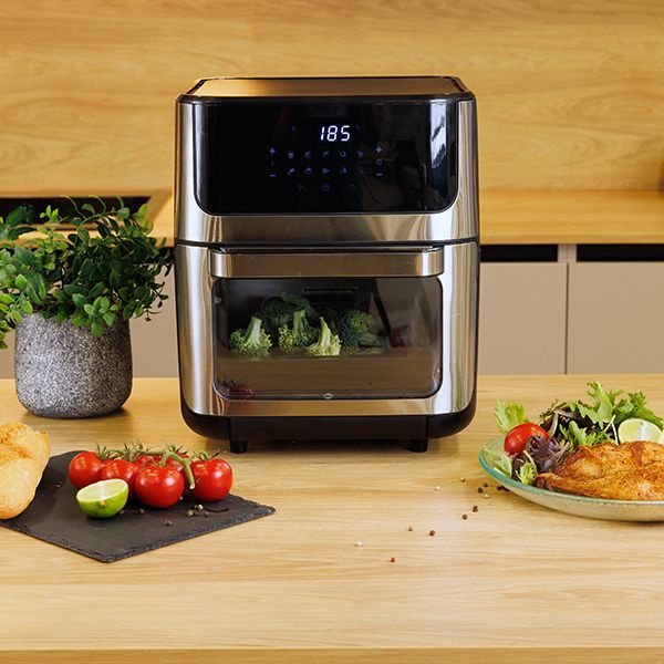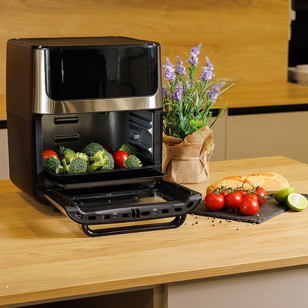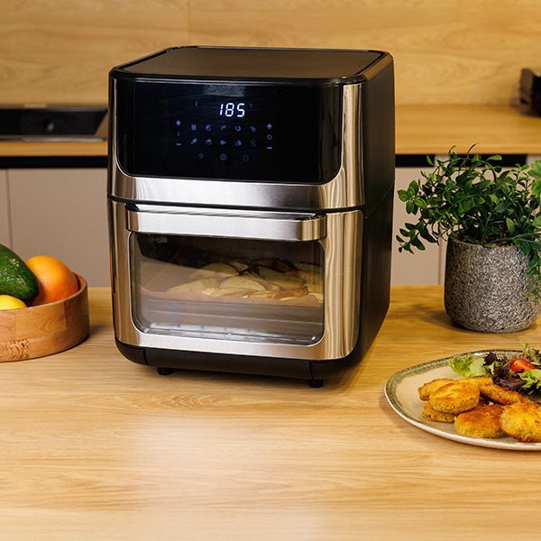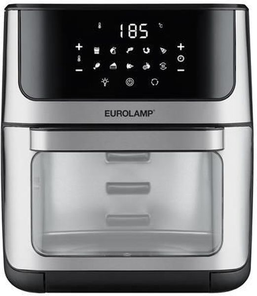 Η φριτέζα αέρος Eurolamp XXL 12L με ισχύ 1800W και χωρητικότητα 12 λίτρα προσφέρει μεγάλη ευελιξία στο μαγείρεμα, συνδυάζοντας πλαστικό και INOX για ανθεκτικότητα και κομψή εμφάνιση. Διαθέτει παράθυρο παρατήρησης με φωτισμό, ψηφιακή οθόνη αφής LCD και 10 έξυπνα προεπιλεγμένα προγράμματα για εύκολο και ακριβές μαγείρεμα. Ο ρυθμιζόμενος θερμοστάτης επιτρέπει λειτουργία από 30°C έως 200°C, ενώ η προστασία υπερθέρμανσης και η λυχνία ένδειξης λειτουργίας εξασφαλίζουν ασφάλεια. Η φριτέζα περιλαμβάνει αφαιρούμενο δίσκο για εύκολο καθαρισμό, κάδο με αποσπώμενη χειρολαβή, δίσκο περισυλλογής λαδιών, διάτρητο ταψί ψησίματος, περιστρεφόμενη σούβλα και περιστρεφόμενο καλάθι τηγανίσματος με λαβή τοποθέτησης.