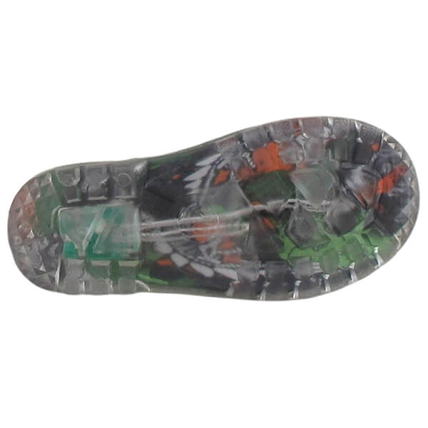 Σε μαύρο και πορτοκαλί χρώμα με διάφανη τρακτερωτή σόλα και μπλε φωτάκια led στο εσωτερικό της.