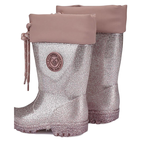 Mayoral με γκλίτερ σε ροζ και ασημί χρώμα, διακοσμημένες υφασμάτινη καφέ λεπτομέρεια περιμετρικά στο επάνω μέρος.