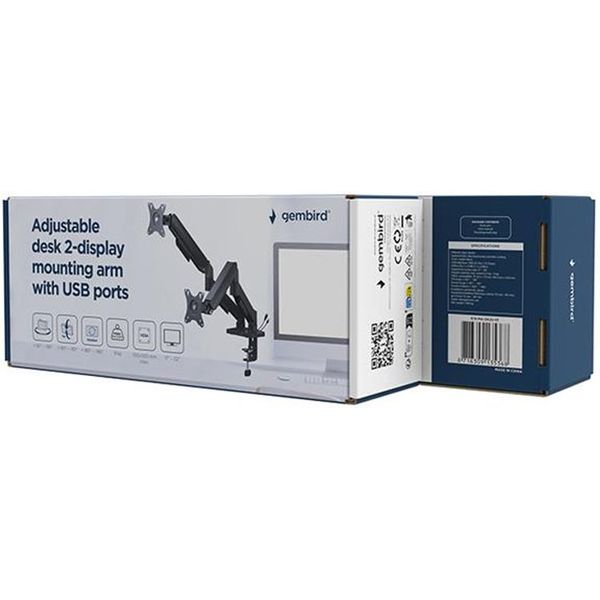 GEMBIRD ADJUSTABLE DESK 2-DISPLAY MOUNTING ARM WITH USB PORTS, 17”-32” BLACK MA-DA2U-01 (PER.272904)