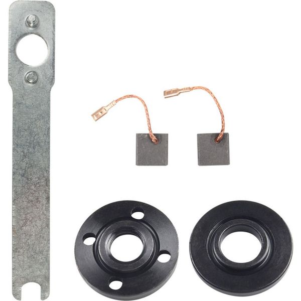 Περιεχόμενα συσκευασίας: 1x Προστατευτικό κάλυμμα με clips, 1x Βοηθητική αντικραδασμική λαβή τριών θέσεων με soft grip, 1x Κλειδί γωνιακού τροχού, 1x Εσωτερική φλάντζα, 1x Εξωτερική φλάντζα, 1x Σετ καρβουνάκια, 1x Εγχειρίδιο χρήσης