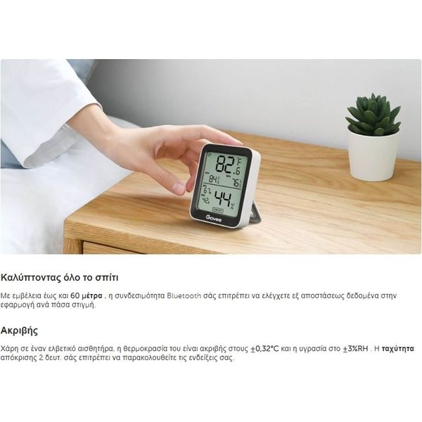 Ακριβής Μέτρηση και Ειδοποιήσεις Με την υψηλή ακρίβεια των αισθητήρων του, το GOVEE H5075 σας επιτρέπει να παρακολουθείτε τις μεταβολές της θερμοκρασίας και της υγρασίας με μεγάλη ακρίβεια. Μπορείτε να ρυθμίσετε ειδοποιήσεις για να σας ενημερώνει όταν οι τιμές ξεπερνούν τα όρια που έχετε θέσει.