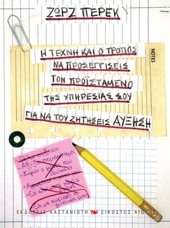 Η ΤΕΧΝΗ ΚΑΙ Ο ΤΡΟΠΟΣ ΝΑ ΠΡΟΣΕΓΓΙΣΕΙΣ ΤΟΝ ΠΡΟΙΣΤΑΜΕΝΟ ΤΗΣ ΥΠΗΡΕΣΙΑΣ ΣΟΥ ΓΙΑ ΝΑ ΤΟΥ ΖΗΤΗΣΕΙΣ ΑΥΞΗΣΗ BKS.0308763 BKS.0308763 PEREC GEORGES PEREC GEORGES ΞΕΝΗ ΛΟΓΟΤΕΧΝΙΑ Κατηγορία: ΞΕΝΗ ΛΟΓΟΤΕΧΝΙΑ •PEREC GEORGES στην κατηγορία ΞΕΝΗ ΛΟΓΟΤΕΧΝΙΑ ISBN: 978-960-03-5807-0 Συγγραφέας: PEREC GEORGES Εκδοτικός οίκος: ΚΑΣΤΑΝΙΩΤΗ Σειρά: ΕΙΚΟΣΤΟΣ ΑΙΩΝΑΣ Σελίδες: 112 Διαστάσεις: 12Χ16, 5 Ημερομηνία Έκδοσης: Νοέμβριος 2014 Το βιβλίο αυτό του Ζωρζ Περέκ, που χαρακτηρίστηκε ως ένα κόσμημα, είναι μια «διήγηση» που ορίζεται από το καυστικό στυλ του συγγραφέα και βασίζεται στις πολλαπλές δυνητικές εξελίξεις μιας ιδέας ή μιας ενέργειας. Το κείμενο δομείται με συνεχόμενους συνδυασμούς και αποτελεί στην ουσία ένα παράδοξο, μια πράξη τόσο καλλιτεχνική όσο και πολιτική. Με το βιβλίο του αυτό ο Περέκ υπογράφει ένα από τα αριστουργήματα της OULIPO, ένα κείμενο δηλαδή που, γραμμένο εξ ανάγκης, μιλάει γι' αυτή την ανάγκη.Ένα βιβλίο που, ταυτόχρονα, διηγείται με τρόπο αγωνιώδη, κωμικό, και καφκικά ειρωνικό τον κόσμο της εργασίας