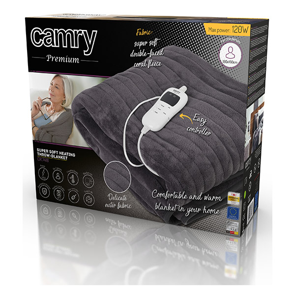 Η ηλεκτρική κουβέρτα Camry 7418 προσφέρει ζεστασιά και άνεση ξεκούρασης, σας επιτρέπει να τυλίξετε το σώμα σας λόγω της μοναδικής απαλότητας του υφάσματος και του τεράστιου μεγέθους 160x180cm. Συνιστάται επίσης σε άτομα που ενδιαφέρονται για την υγεία. Ανακουφίζει από τη νευραλγία, καταπραΰνει τους δύσκαμπτους μύες και βελτιώνει την κυκλοφορία του αίματος. Ανακουφίζει επίσης από τα ρευματικά συμπτώματα. Παρέχει γρήγορη και ομοιόμορφη κατανομή της θερμότητας, η οποία σας επιτρέπει να απολαύσετε τη θερμότητα ενώ κάθεστε στην καρέκλα. Η κουβέρτα είναι κατασκευασμένη από αφράτο και ευχάριστο στην αφή υλικό. Μπορεί να πλυθεί αφού αποσυνδέσετε το καλώδιο τροφοδοσίας και τον ελεγκτή θερμοκρασίας. Ο ελεγκτής σας επιτρέπει να επιλέξετε το επίπεδο θερμοκρασίας και να προστατεύσετε από υπερθέρμανση. Χαρακτηριστικά: - Αποσπώμενο καλώδιο ρεύματος με ελεγκτή LCD. - Πλένεται στο πλυντήριο σε θερμοκρασία 30°C. - Μέγεθος κατάλληλο για ένα άτομο για να τυλίξει το σώμα με μια κουβέρτα 160x180cm. - Εύκολο στον έλεγχο. - 7 επίπεδα θέρμανσης, συν λειτουργίες HIGH και LOW. - Ύφασμα εξαιρετικά απαλό κοραλλιογενές φλις διπλής όψης. - Ο χρονοδιακόπτης αλλάζει αυτόματα από τη λειτουργία ΥΨΗΛΗ σε ΧΑΜΗΛΗ θερμοκρασία μετά από 1 ώρα. - Προστασία από υπερθέρμανση. - Προστασία πάνω από το ρεύμα. Ισχύς: 110-120W.Τροφοδοσία: 220-240V ~50 Hz.Χρονοδιακόπτης: 1-9 ώρες.Χρώμα: Μαύρο.Εγγύηση: 2 χρόνια. DOA 7 ημερών