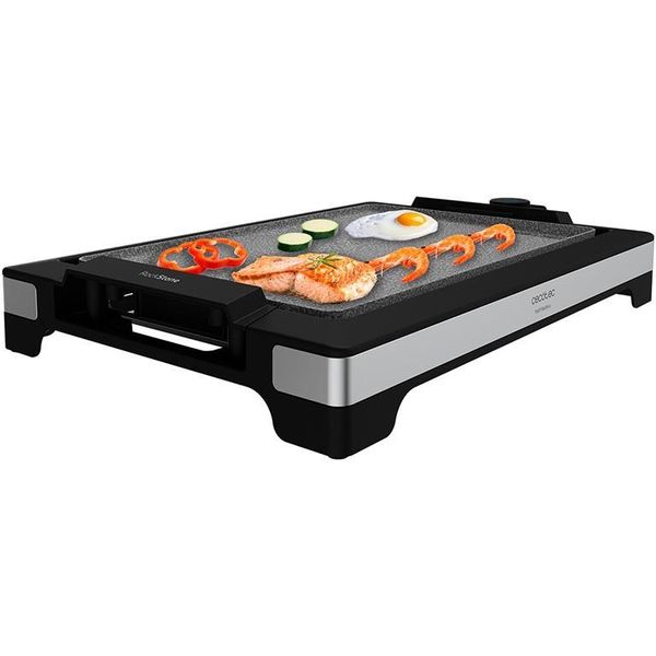 Η ηλεκτρική ψηστιέρα γκριλιέρα της Cecotec διαθέτει ισχύ 2000 W με ρυθμιζόμενο θερμοστάτη 5 επιπέδων για εύκολη προσαρμογή της θερμοκρασίας. Με φινίρισμα από ανοξείδωτο ατσάλι, αντικολλητική οικολογική επίστρωση RockStone και δύο διαφορετικές επιφάνειες, επίπεδη και με ραβδώσεις (grill), αποτελεί ιδανική επιλογή για ψήσιμο κρεατικών, λαχανικών, αυγών, ψαριών, οστρακοειδών, κρεπών και άλλων. Περιλαμβάνει χειρολαβή "cool touch" για προστασία από τη θερμότητα και αποσπώμενα εξαρτήματα που πλένονται στο πλυντήριο πιάτων. Επιπλέον, διαθέτει ενσωματωμένο δοχείο συλλογής λίπους, αντιολισθητική βάση και είναι κατάλληλα σχεδιασμένη ώστε να τοποθετείται απευθείας στο τραπέζι!