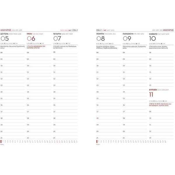 Εβδομαδιαίο ημερολόγιο με εύκαμπτο εξώφυλλο από δερματίνη με ανάγλυφη υφή, στρογγυλεμένες γωνίες και λάστιχο για να το κρατάει κλειστό. Το έτος είναι τυπωμένο στο εξώφυλλο με τη μέθοδο της βαθυτυπίας. Εσωτερικά έχει δίχρωμη εκτύπωση σε λευκό χαρτί 70γρ. Περιέχει συνοπτικά ημερολόγια και πλάνα, παγκόσμιες ημέρες, εορτολόγιο, Ανατολή - Δύση, φάσεις Σελήνης, χρήσιμες πληροφορίες, καθώς και τηλεφωνικό ευρετήριο.