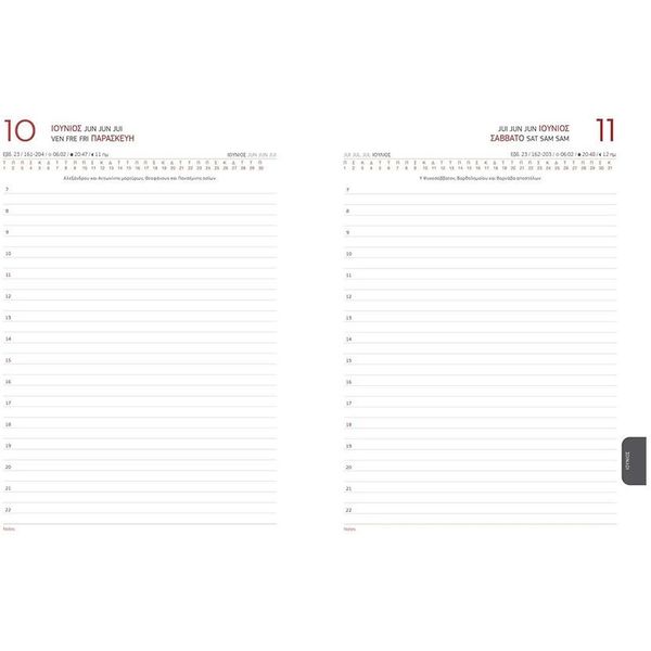 Ημερήσιο ημερολόγιο με εύκαμπτο εξώφυλλο από δερματίνη, στρογγυλεμένες γωνίες και λάστιχο για να το κρατάει κλειστό. Το έτος είναι τυπωμένο στο εξώφυλλο με τη μέθοδο της βαθυτυπίας. Εσωτερικά έχει δίχρωμη εκτύπωση σε λευκό χαρτί 70γρ. Περιέχει το Σάββατο και την Κυριακή σε ξεχωριστές σελίδες, συνοπτικά ημερολόγια και πλάνα, παγκόσμιες ημέρες, εορτολόγιο, Ανατολή - Δύση, φάσεις Σελήνης, χρήσιμες πληροφορίες, καθώς και τηλεφωνικό ευρετήριο.