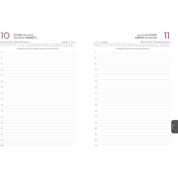 Ημερήσιο ημερολόγιο σπιράλ με τετράχρωμη εκτύπωση στο κάλυμμα και glossy πλαστικοποίηση. Το εσωτερικό διαθέτει δίχρωμη εκτύπωση σε χαρτί 70γρ. με ξεχωριστές σελίδες για το Σάββατο και την Κυριακή. Περιλαμβάνει συνοπτικά ημερολόγια και πλάνα, Ανατολή-Δύση, φάσεις Σελήνης, παγκόσμιες ημέρες, εορτολόγιο, επίσημες αργίες και χρήσιμες πληροφορίες καθώς και τηλεφωνικό ευρετήριο.