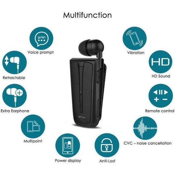 Το RH219s είναι το νέο πρωτοποριακό προϊόν της iPro με δόνηση, καλώδιο περιέλιξης και αποσπώμενο 2ο ακουστικό! Έχει εξαιρετική ποιότητα ήχου, είναι ιδιαίτερα ελαφρύ μόλις 18,5gr και άνετο για καθημερινή χρήση. Διαθέτει τεχνολογία Multipoint που επιτρέπει την ταυτόχρονη σύνδεση και διαχείριση κλήσεων δύο συσκευών με το ακουστικό. Χάρη στη λειτουργία Power Display, σας δίνεται η δυνατότητα παρακολούθησης του επιπέδου μπαταρίας του Bluetooth από την οθόνη του κινητού σας. Διαθέτει ενσωματωμένα φωνητικά μηνύματα προτροπής σε Ελληνικά ή Αγγλικά που επιτρέπουν στον χρήστη να ενημερώνεται για την τρέχουσα κατάσταση του ακουστικού αλλά και τον αριθμό του καλούντος. Παράλληλα χάρη στη λειτουργία Anti-Lost, το iPro RH219s θα σας ειδοποιήσει μέσω δόνησης όταν η απόσταση μεταξύ της συσκευής που έχει γίνει σύζευξη επεκταθεί των 10m (προβλεπόμενο εύρος λειτουργίας). Προσφέρει πολλαπλές λύσεις μεταφοράς χρησιμοποιώντας είτε το κλιπ είτε το strap λαιμού που περιλαμβάνεται στην συσκευασία, ώστε να επιλέξετε τον βέλτιστο για εσάς τρόπο.