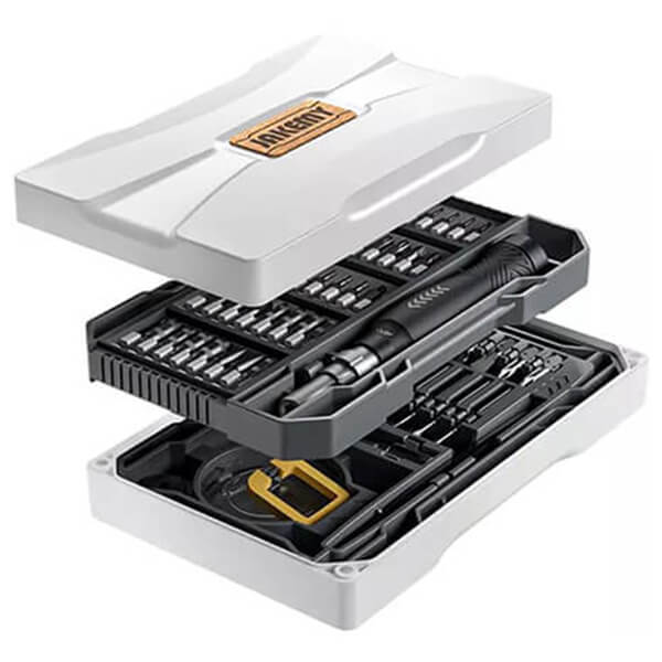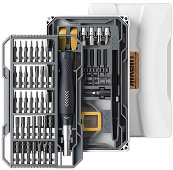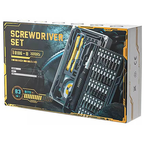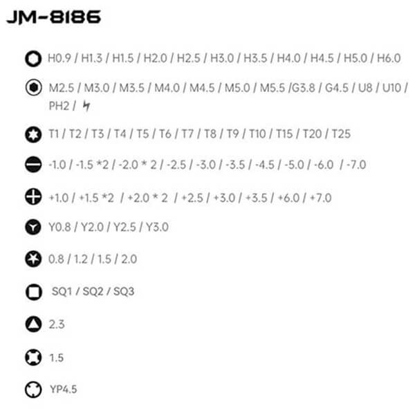 83 τεμαχίων σετ κατσαβιδιών με μύτες ακριβείας με μαλακή TPR λαβή JM-8186 B. Χαρακτηριστικά: - Επαγγελματική διαμόρφωση για μεγάλη γκάμα. Με μια ποικιλία εργαλείων, συμπαγή και φορητά, εύκολα για τις εργασίες συναρμολόγησης και αποσυναρμολόγησης. Κάθε αξεσουάρ μπορεί να σας βοηθήσει την κατάλληλη στιγμή. - Σχεδιασμός συσκευασίας σε στυλ Cyber, μοναδική συλλεκτική αξία. - Φιλικό προς το περιβάλλον τρισδιάστατο λογότυπο από φελλό, που επιδεικνύει φιλικό προς το περιβάλλον μινιμαλιστικό στυλ. - 6 νέα μοντέλα μύτες κατσαβιδιού, που βρίσκουν εφαρμογή σε μια μεγάλη γκάμα εργασιών. - Λαβή κατσαβιδιού σε στυλ 3D χαρακτικής με σχέδιο περιστρεφόμενου καπακιού στην ουρά. Η διεπαφή λαβής είναι εξοπλισμένη με ισχυρό μαγνήτη βιομηχανικής ποιότητας N35. Ενσωματωμένη μπάρα επέκτασης στη λαβή. Το μήκος μπορεί να ρυθμιστεί σε τμήματα. - Επαγγελματική διαμόρφωση για νέα εμπειρία. Περιεχόμενα συσκευασίας: - Μύτες κατσαβιδιού S-2 45mm deep hole: Flat-head (Slotted): 1.5 2.0 / Phillips: 1.5 2.0. - Μύτες κατσαβιδιού H6.3 25mm CR-V: Flat-head (Slotted): 6.0 7.0 / Phillips: 6.0 6.5. - Υποδοχές: M2.5 M3.0 M3.5 M4.0 M4.5 M5.0 M5.5 G3.8 G4.5 U8 U10 PH2 U. - Μύτες κατσαβιδιού CR-V: Hex: H0.9 H1.3 H1.5 H2.0 H2.5 H3.0 H3.5 H4.0 H4.5 H5.0 H6.0 / Torx: T1 T2 T3 T4 T5 T6 T7 T8 T9 T10 T15 T20 T25 / Flat-head (Slotted): 1.0 1.5 2.0 2.5 3.0 3.5 4.5 5.0 / Phillips: 1.0 1.5 2.0 2.5 3.0 3.5 / Tri-wing: Y0.8 Y2.0 Y2.5 Y3.0 / Pentagon: 0.8 1.2 1.5 2.0 / Square: SQ0 SQ1 SQ2 / Triangle: 2.3 / Standoff(Motherboard Phillips): 1.5 / Three-point Crowned Shape: YP4.5. - Spudger x2 (85x12 mm).