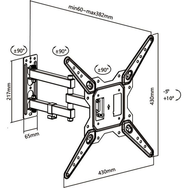 • Διαστάσεις VESA: 100x100, 100x200, 200x100, 200x200, 300x200, 300x300, 400x200, 400x300, 400x400 χιλ. • Συμβατά μεγέθη οθόνης: 23 έως 42 ίντσες / 58, 42 έως 106, 68 cm. • Μέγιστο φορτίο: 30 κιλά. • Απόσταση από τον τοίχο: 5, 6 έως 38, 2 εκατοστά. • Οριζόντια ρύθμιση: ±90° γωνία. • Κάθετη ρύθμιση: -5° έως +10° γωνία. • Στοιχεία: 3. • Βραχίονες: 2. • Χρώμα: Μαύρο. • Υλικό: Μέταλλο. • Διαστάσεις συσκευασίας: Π: 30 cm, Υ: 24 cm, Β: 7 cm. • Κωδικός Κατασκευαστή: JL42865/EXTRA / ELB-2342/3/MAX. • Συσκευασία: Giftbox. • Εγγύηση: 2 Χρόνια. DOA 7 ημερών