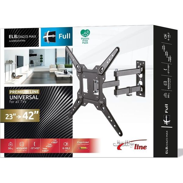 JOLLYLINE ELB-2342/3/MAX ΒΑΣΗ TOIXOY TV 23-42 MOTION 30KGPER.801278PER.801278JOLLYLINEJOLLYLINEΒΑΣΕΙΣ ΣΤΗΡΙΞΗΣ TVΚατηγορία: ΒΑΣΕΙΣ ΣΤΗΡΙΞΗΣ TV •JOLLYLINE στην κατηγορία ΒΑΣΕΙΣ ΣΤΗΡΙΞΗΣ TV Η ρυθμιζόμενη βάση ELB-2342/3/MAX JollyLine, με επιπλέον οριζόντια κινητή άρθρωση για μεγαλύτερη ευελιξία, προορίζεται για στερέωση τηλεόρασης ή οθόνης 23 έως 42 ιντσών (58, 42 έως 106, 68 cm) και βάρους έως 30 κιλά, σε κάθετη επιφάνεια εσωτερικού χώρου. Ο εργονομικός σχεδιασμός της επιτρέπει την απόκρυψη της όδευσης του καλωδίου πίσω από τη βάση, ενώ η απόσταση από τον τοίχο είναι 5, 6 έως 38, 2 εκατοστά, ιδανική για κουζίνες και υπνοδωμάτια. Η βάση προορίζεται για εγκατάσταση από εξειδικευμένο τεχνικό και μόνο σε επιφάνειες που πληρούν τις απαιτήσεις στήριξης σύμφωνα με τις προδιαγραφές της.