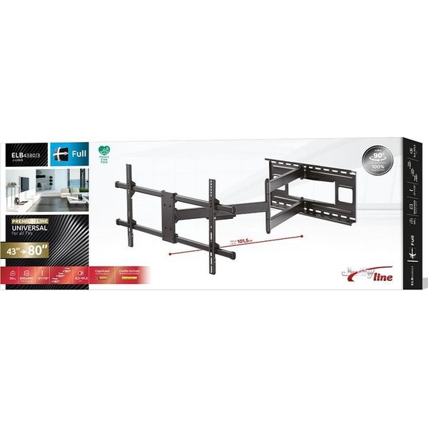 Η πολλαπλά ρυθμιζόμενη βάση ELB-4380/3 JollyLine προορίζεται για στερέωση τηλεόρασης ή οθόνης 43 έως 80 ιντσών (109,22 έως 203,2 cm) και βάρους έως 50 κιλά, σε κάθετη επιφάνεια εσωτερικού χώρου. Διαθέτει παντογραφική κίνηση βραχιόνων, προσφέροντας εργονομία και απόκρυψη της όδευσης του καλωδίου πίσω από τη βάση. Η εγκατάσταση πρέπει να γίνει από εξειδικευμένο τεχνικό προσωπικό και μόνο σε κατάλληλες επιφάνειες στήριξης σύμφωνα με τις προδιαγραφές της βάσης και της συσκευής.